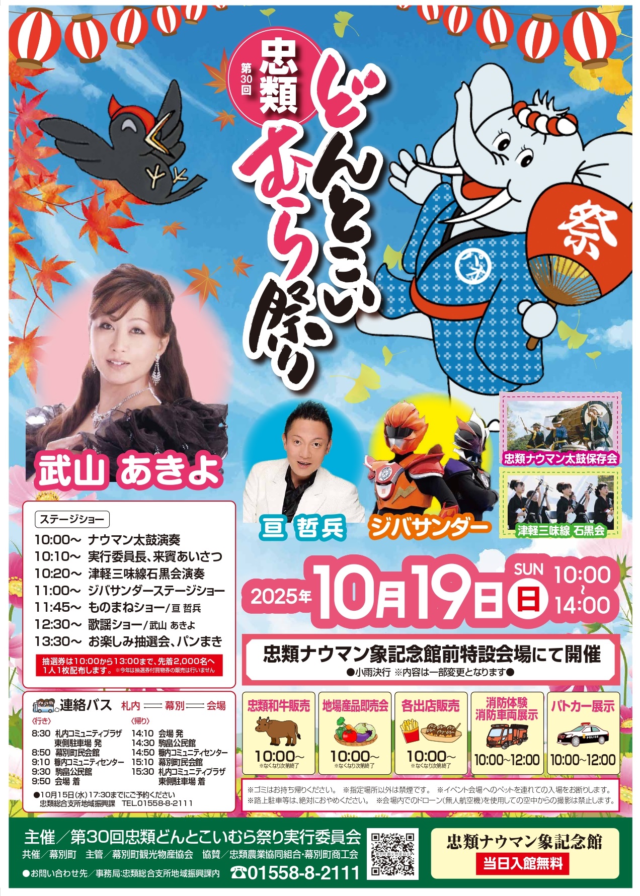 第30回忠類どんとこいむら祭り ステージではゲストによる歌謡ショーが行われ、地場産のゆり根や忠類産和牛の特価販売もあります。 お楽しみ抽選会では豪華景品が当たるチャンスもございますので奮ってご参加ください。 パンフレット・チラシを見る 開催日 2025年10月19日 開催場所 道の駅忠類 特設会場 駐車場 あり 料金 入場無料 お問合せ先 幕別町忠類総合支所地域振興課 01558-8-2111 近くで開催されるイベント 第30回忠類どんとこいむら祭り 幕別町 event 2025年10月19日 location_on 道の駅忠類 特設会場 カテゴリ グルメ・収穫祭 ファミリー向け 季節行事 祭り・伝統行事 エリア 幕別町 このイベントをシェアする イベント一覧に戻る