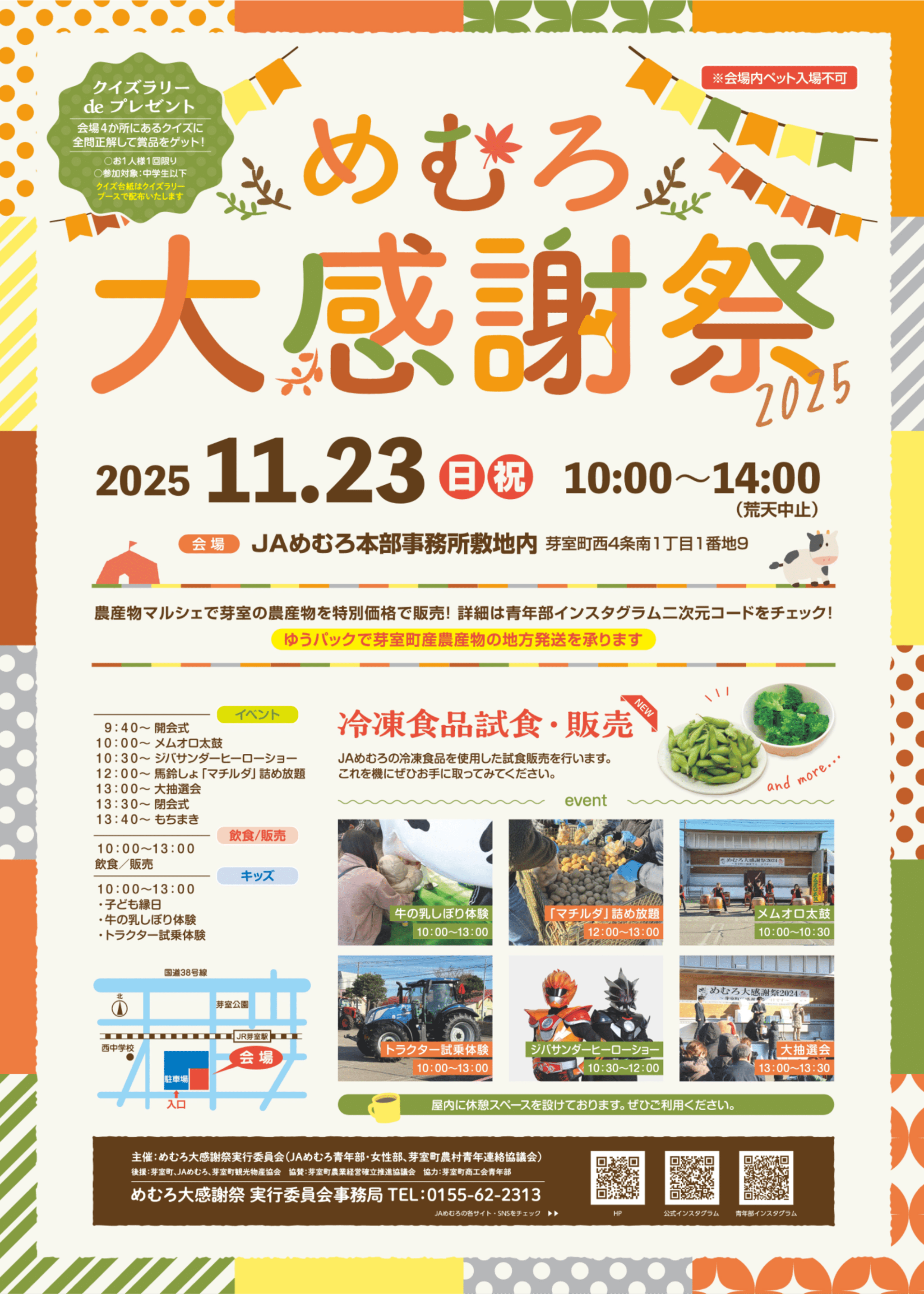 | お問合せ先 | めむろ大感謝祭実行委員会事務局(JAめむろ営農部営農情報課)TEL: 0155-62-2313 |