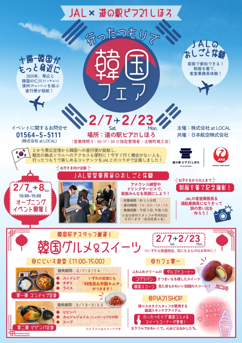 JALおしごと体験や制服を着て記念撮影、また韓国好きなスタッフ厳選のグルメ&スイーツをご用意しています。